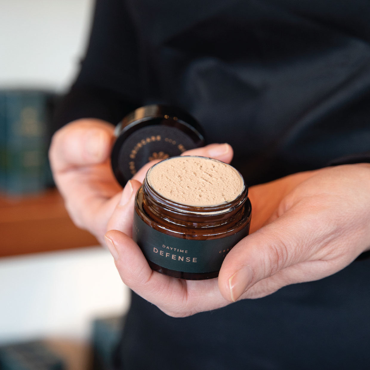 Daytime Defense is a uniquely matte textured tinted finishing product of high mineral content meant to be worn on the surface of the skin during daylight hours as a sun protectant.